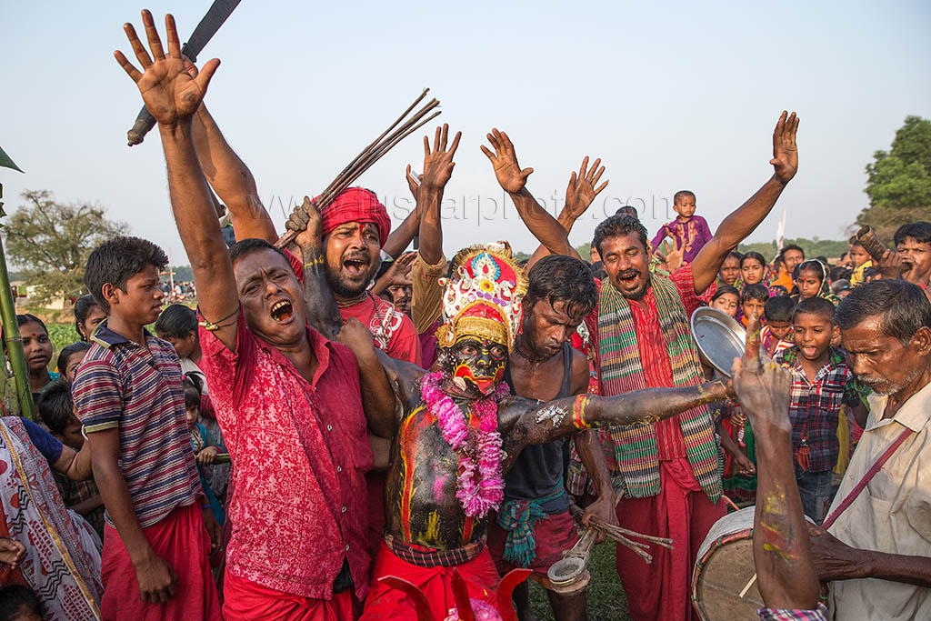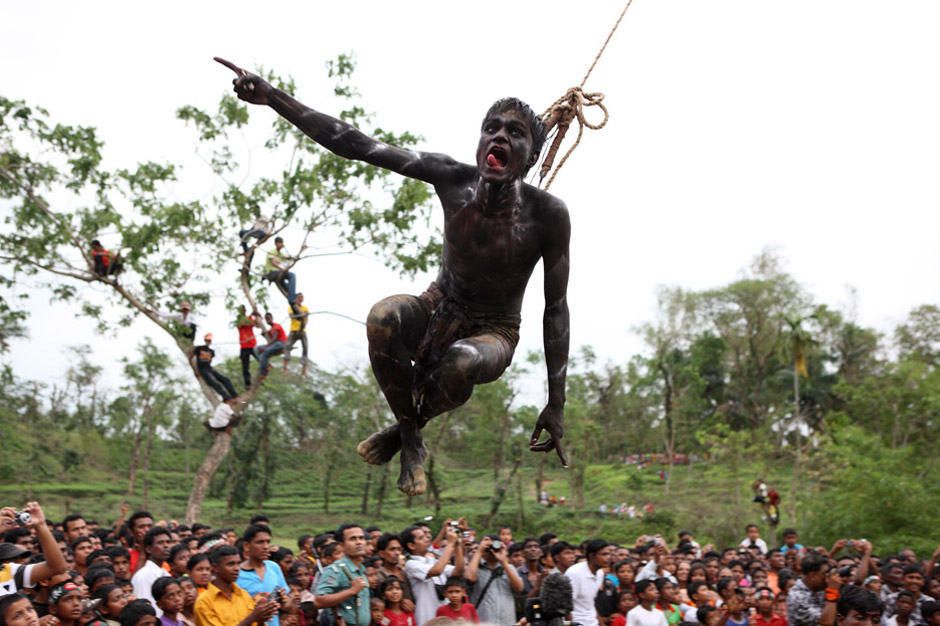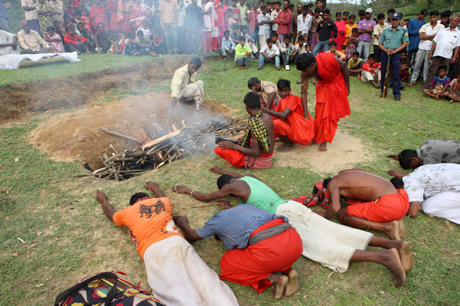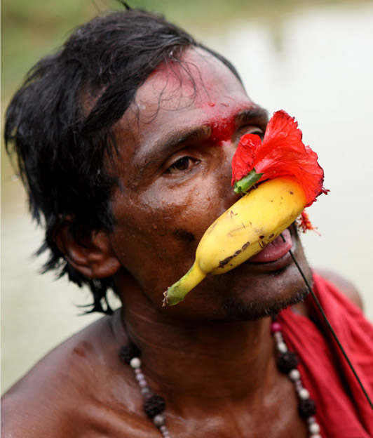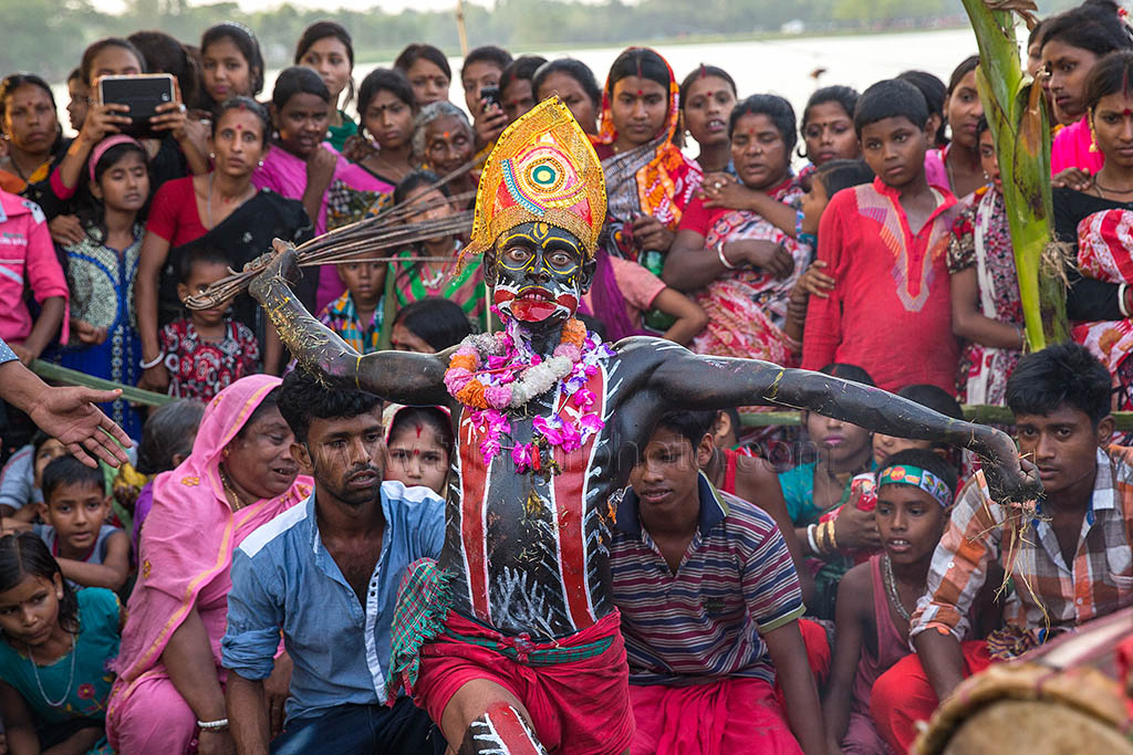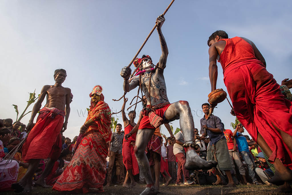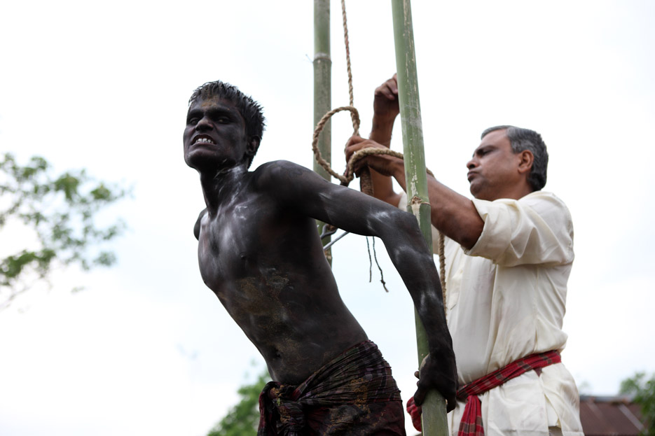 A group of Hindu devotees performs the rituals of Charak Puja. It is a very enchanting folk festival of the Southern Belt of Bangladesh and West Bengal. It is also known as “Nil Puja”. The believers of the Hindu religion celebrate this on the last day of the Bengali month of the year (Chaitra Songkranti). People believe that the festival will carry prosperity by eliminating the sorrow and sufferings of the previous year. The festival is actually a festival to satisfy “Lord Shiva”, the great “Debadideb” of Hindu Religion. Sylhet, Bangladesh. April 14, 2010