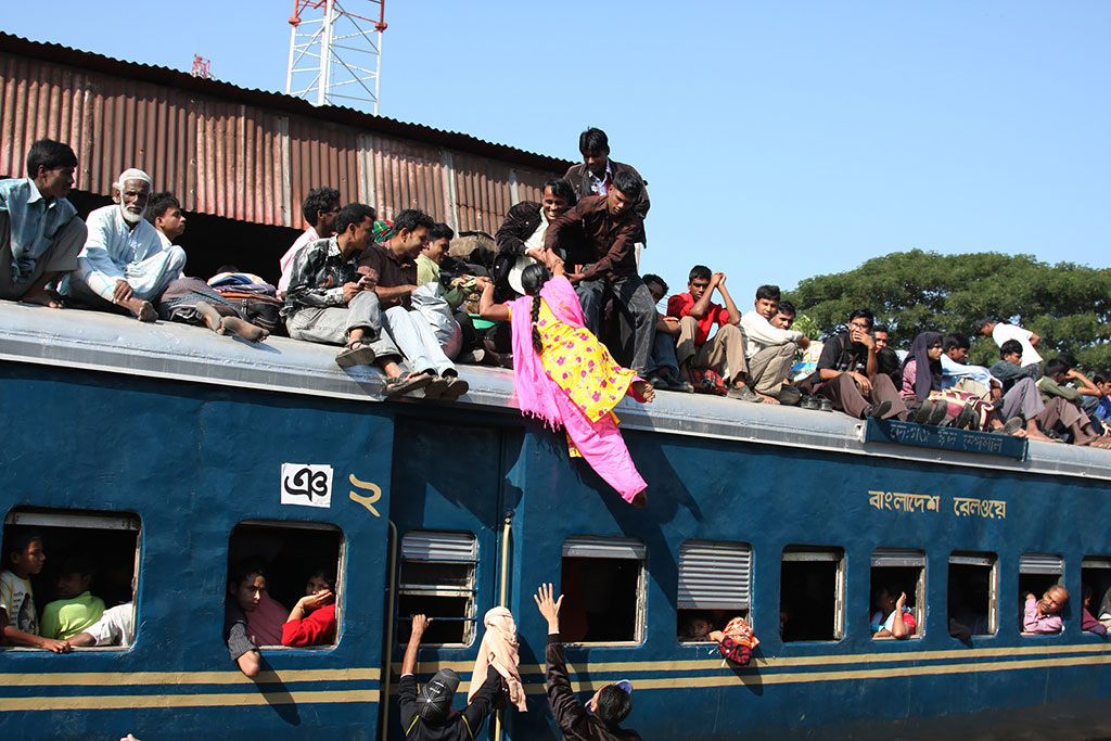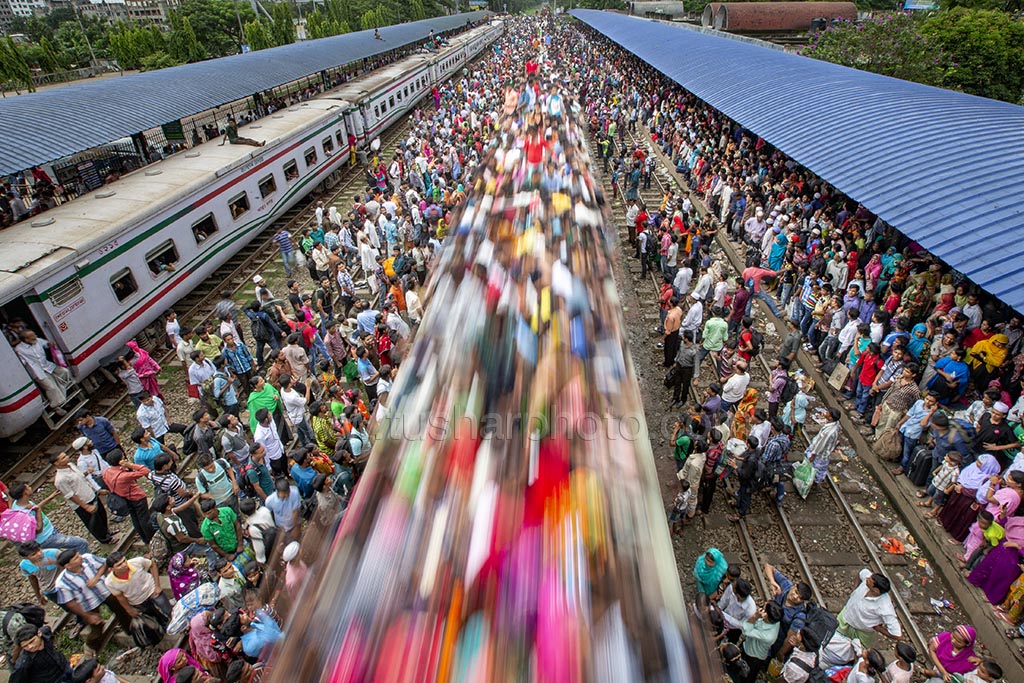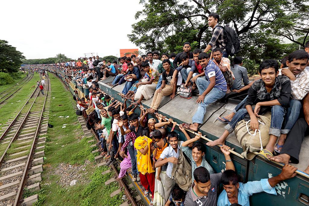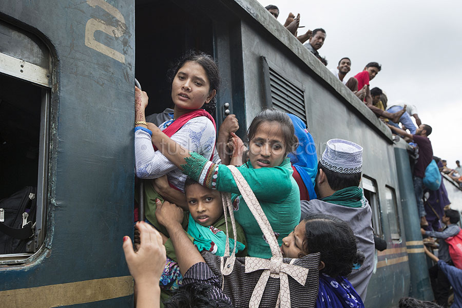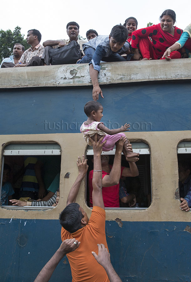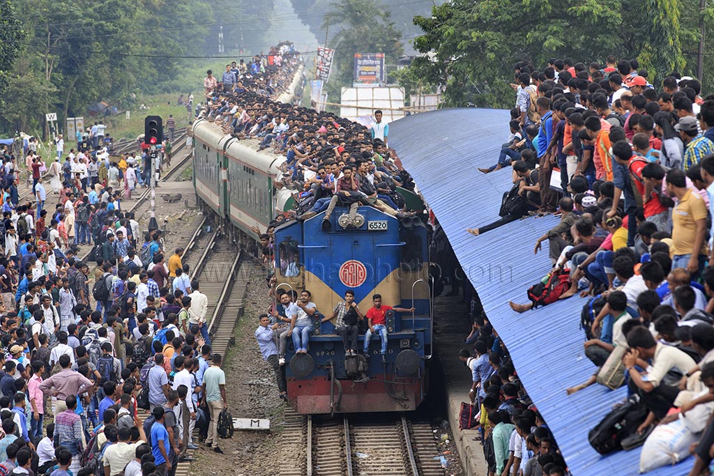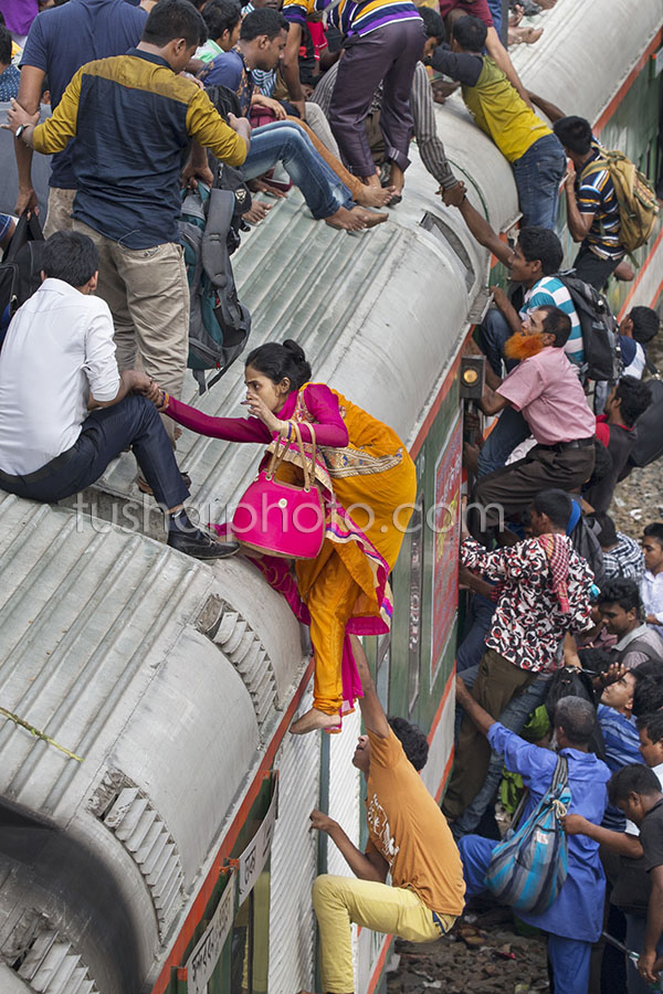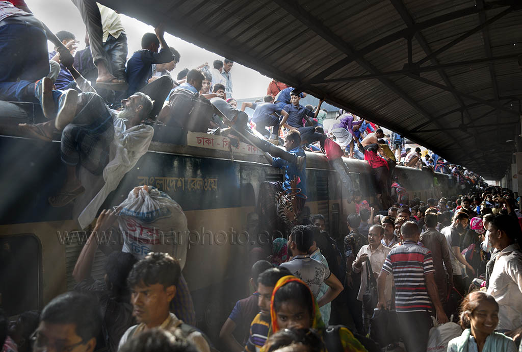 Trains are one of the major modes of transport in Bangladesh. On the occasion of a major festival or a religious program, most people choose to take a train.  Eid is one of the biggest religious festivals in Bangladesh. Failed to get a place inside the train; people are climbing on the roof and outside the train during “Eid-ul-Fitr”, a Muslim religious festival, all over Bangladesh, mainly to go to their original homes in villages. Inhabitants of the capital are taking this risk with their lives to reach their goal.