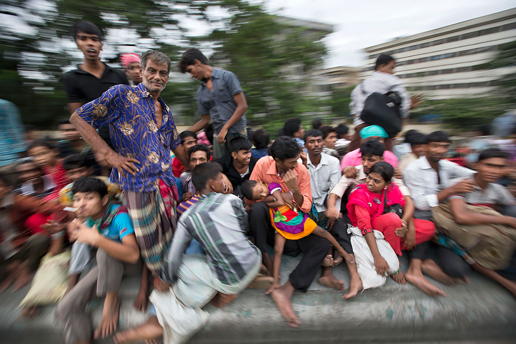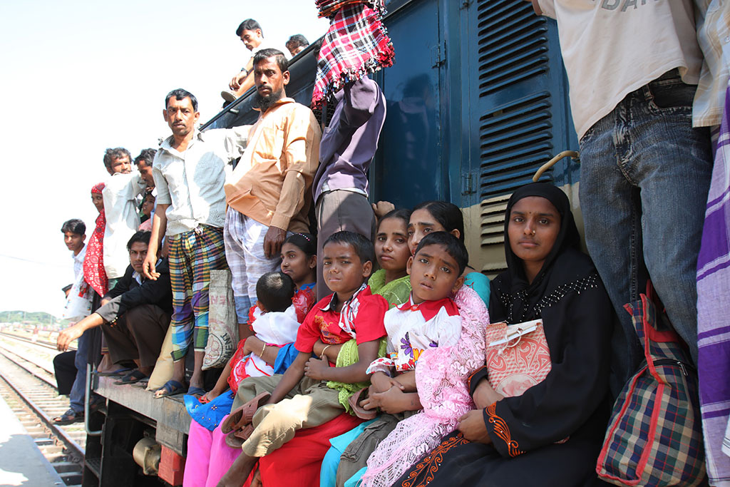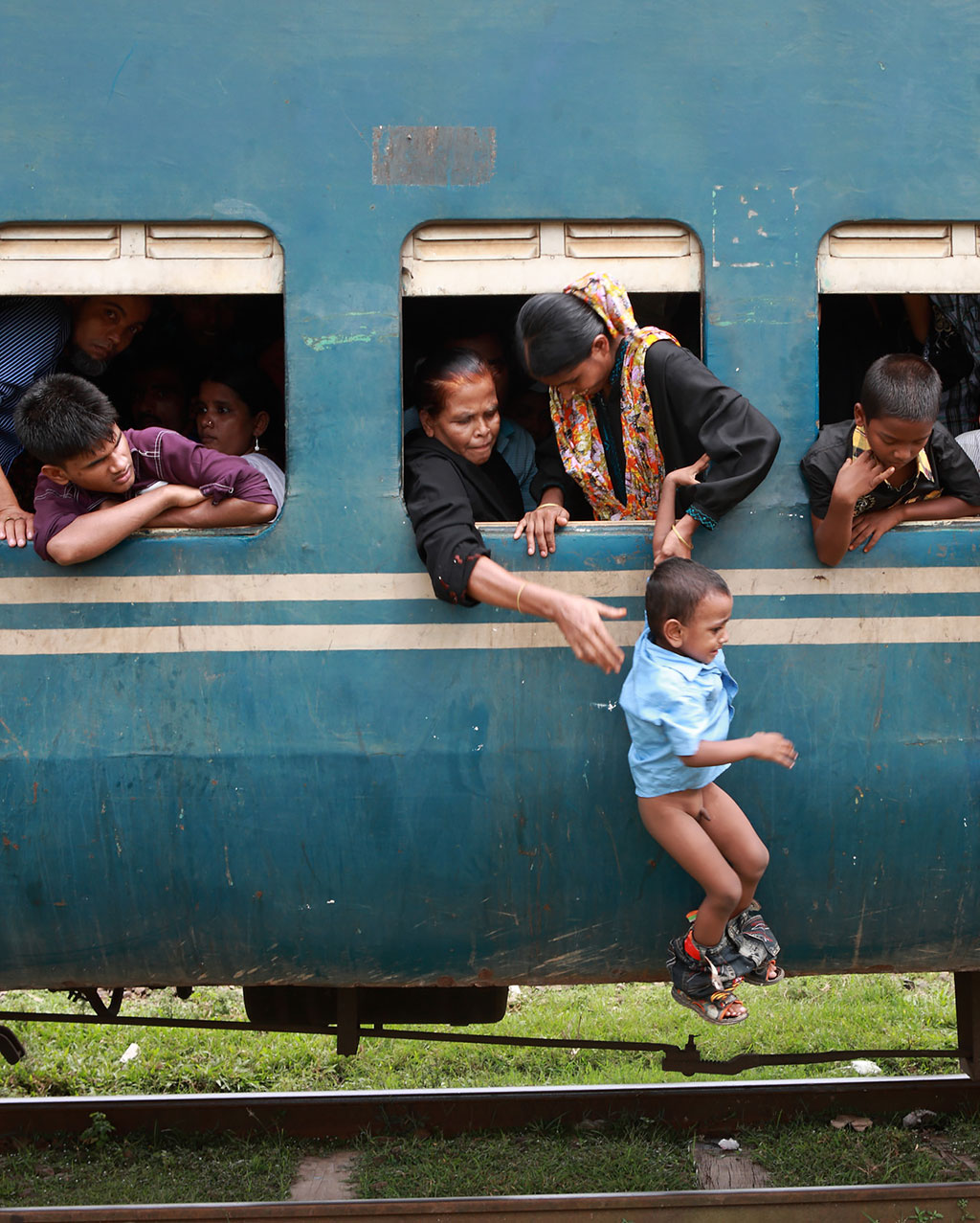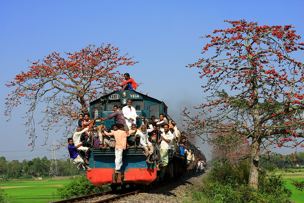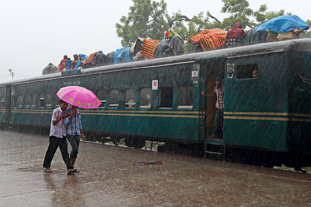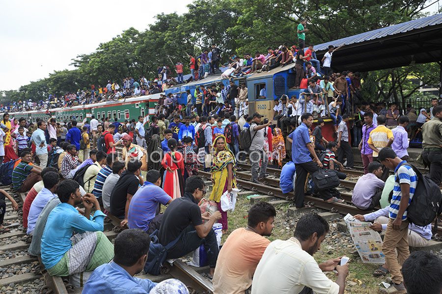 Trains are one of the major modes of transport in Bangladesh. On the occasion of a major festival or a religious program, most people choose to take a train.  Eid is one of the biggest religious festivals in Bangladesh. Failed to get a place inside the train; people are climbing on the roof and outside the train during “Eid-ul-Fitr”, a Muslim religious festival, all over Bangladesh, mainly to go to their original homes in villages. Inhabitants of the capital are taking this risk with their lives to reach their goal.